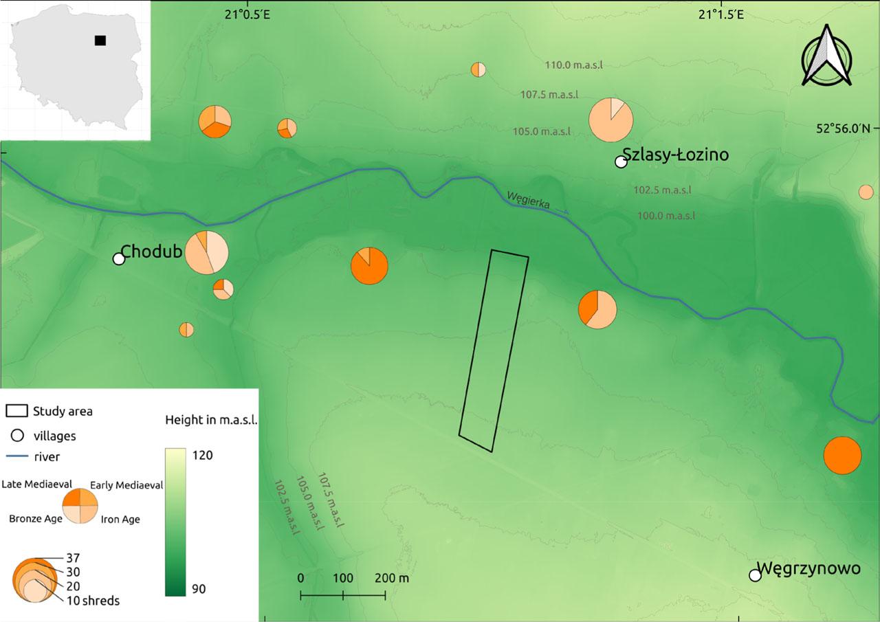 The immediate vicinity of the studied slope has been settled occasionally since the Bronze Age. Information about settlement activity is based on the Polish National Record of Archaeological Sites programme (Ministerstwo Kultury i Dziedzictwa Narodowego 2014)–from surface surveys only, not from excavation documentation. There are four sites dated to the Bronze Age in the range of 1.5 km around the studied slope. The sites consisted of 2–16 ceramic shreds found during the surface study. There are eight sites dated to the Iron Age. The number of shreds was in the range of 2–33. In the Early Mediaeval period, there was a fall in human activity in this area. During surface studies, only six sites from this period were identified. The shred count was from 2–7. In the Late Mediaeval period, together with the Early Modern period, six sites were identified with 2–27 ceramic shreds.