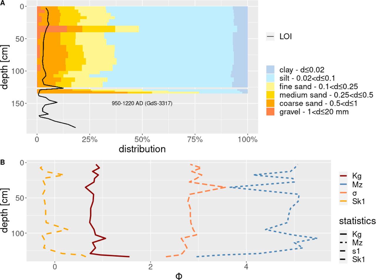 Grain size analysis of the deposits from the footslope was conducted using the laser method on the Malvem Mastersizer 3000. Only the top 140 cm was analysed using this method, as the deeper sediments were deposited in thin layers and the samples from the core were too small for the analysis. Complementary to this method, sieve analysis was used for the particles above 0.5 mm. The results are presented in Figure 2 and were used to calculate the statistical features after Folk & Ward (1957). The soil texture was determined after the United States Department of Agriculture (2019).