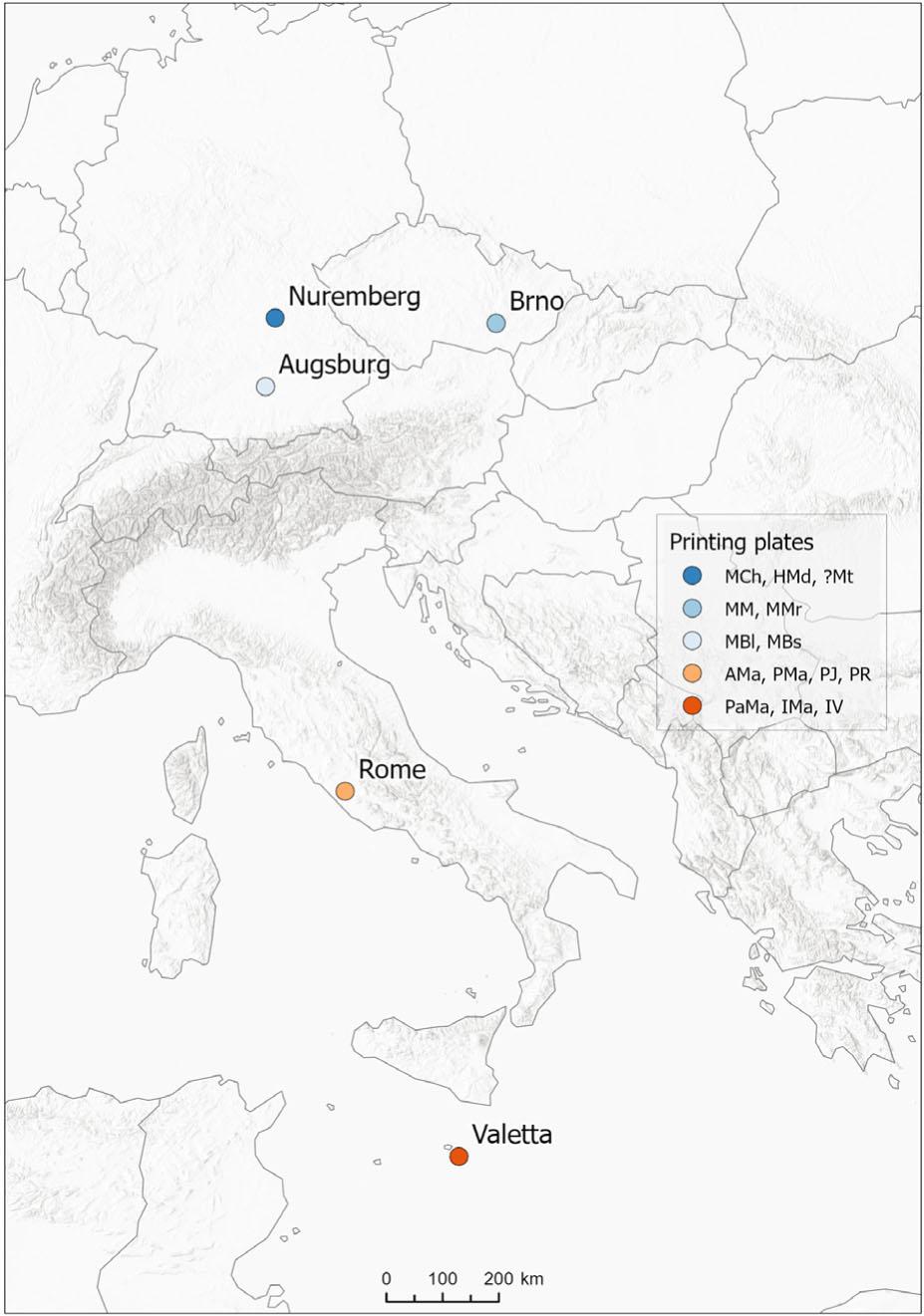 The issue of accurate plate thickness measurement is debatable from several angles. The selected method finds limits in the device used. In order to be able to consider the measured thickness values as representative, it is appropriate to convert them to another indicator –for example, bulk density. Unlike the density of the metal, this assumes a certain degree of material inconsistency in the form of pores, cavities, and so on. However, this indicator is sufficient for a basic comparison. The density of copper corresponds to c.8.96 g/cm3. The average value of the measured set isc.9 g/cm3. This value can also be validated thanks to the preserved printing plate of a map of a part of South America by G. Sanson and A. H. Jaillot from 1674 (Davis-Allen & Reinhartz 1990). Its bulk density is c.8.5 g/cm3. Therefore, with the exception of a few outliers, the measured thickness values can be considered relevant (see appendices 2 and 3). With regard to geographical aspects, this printing plate appears to have a more compact set of plates from the area north of the Alps. The standard deviation corresponds to approximately 1 g/m3 compared to c.2.7 g/m3 in the Mediterranean area. The smallest values of bulk density were achieved for printing plates that were engraved in Valletta (PaMa, IMa, IV), geographically furthest from the source of the raw material. The mines in Hungary (today’s Slovakia) produced some of the main copper ore deposits, but the Italians also used other sources, such as from the Tyrol area (Woodward 1996). This finding offers space for additional research into the geographical correlation between the quality of the copperplates used and the place of extraction of the input raw material. It is necessary to take into account the fact that the cited data work within the time period of the 16th and 17th centuries. The comparison of the two largest sets of printing plates, MBl and MBs, which were prepared by the Augsburg engraver Michael Kauffer over a period of six years, brings interesting results. MBl reaches an average bulk density of 8.5 g/cm3, MBs 9.8 g/cm3. The size of the standard deviation does not exceed 1 g/cm3 for both equally large groups. It is worth noting the noticeable change in the quality of the material in the form of copper purity in the very short term. As early as the 16th century, most of the copper trade was controlled by the Bavarian cities of Nuremberg and Augsburg (Woodward 1996). It is a matter of discussion whether the cause can be found in a qualitatively different source of copper ore or in the shortcomings of the metallurgical process of its extraction. However, from the achieved results, it is not possible to deduce the differences between the two cities, Nuremberg and Augsburg, in terms of preference for the materials used and their resources. The occurrence is rather accidental, as the same engraver (Michael Kauffer) worked in the case of MBl and MBs with qualitatively different materials in a relatively short period of time (1720–1726).