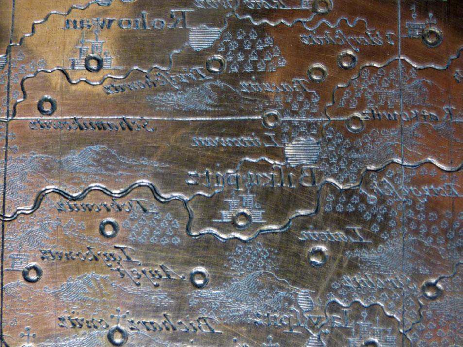 Other printing plates are owned by the Plantin-Moretus Museum in Antwerp. (8) As part of the museum’s permanent exhibition, printing plates of the plan of Cambrai, France (1581) and Utrecht, the Netherlands (1581) are on display. An etching of the plan of the town of Kingston upon Hull (c.1642), which is owned by the British Library, comes from the hands of the prominent Czech Baroque artist Václav Hollar. (9) This is probably his only surviving plate with a cartographic theme. The library’s collections include, for example, a copperplate of the right of the plan of the Dutch coast, engraved by Antonio Francesco Lucini in Florence around 1640. An unsigned and undated copperplate (c.1580) copying part of the wall map of England and Wales by Christopher Saxton can be found in the library catalogue. (10) In 2016, the library acquired a set of nine copperplates of maps of India, and triangulation diagrams for the needs of the East India Company from the turn of the 18th and 19th centuries. (11) Another existing plate is of the province of San Diego, created by the engraver Antonio Ysarti in Mexico City, probably in 1682. (12) According to a model from Joan Blaeu’s atlas, a copper engraving of the city of Bruges by engraver Reinier Blockhuys was created in the 1830s. Complete sets of copperplates have been documented for maps of, for example, water systems, polders, military maps, especially in the Netherlands. Numerous sets of 18–20th century hydrographic charts for military naval purposes can be found in public collections. (13) For completeness of the search, several other studies dealing with preserved printing plates can be quoted (Grove & Wallis 1991, David 2008a, Batten 2010, McKee 2010, Reinhartz 2018). A detailed analysis of a complete set of plates of this type has not yet been carried out.