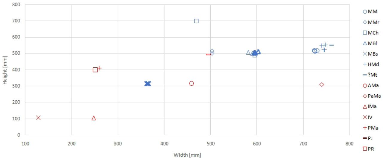 The dimensions of the individual printing plates plotted on the scatter plot (see Fig. 3) show the expected variability in width and height. Logically, the format of the printing plate depends on the size of the displayed area and the selected scale. The investigated set includes small-format maps for book illustrations (IV, IMa) as well as separate large-format maps (PaMa, MM, HMd, ?Mt, MCh or MBl). In particular, MBs and MM printing plates form a compact size file without significant deviations. MBl and HMd show higher variability. The position of the values plotted in the graph shows the deviation between the registers and the map part of MM. The discrepancy in both sets is also confirmed by other measured quantities (see figures 4 and 5). The obtained values indicate different times of origin and quality of production technology.
