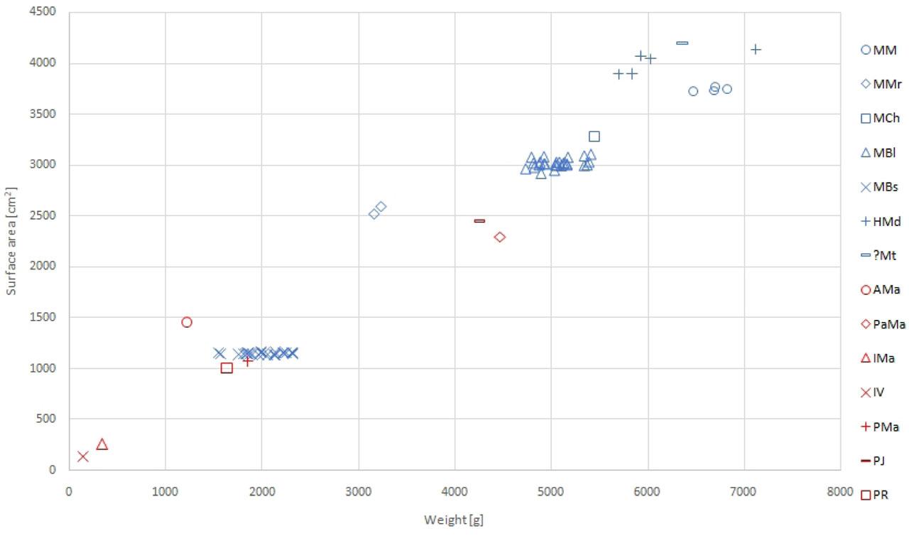 A linear relationship between the weight and the area of the printing plates is observable across the examined set (see Fig. 4). It is worth noting the distribution of MBs values, which form a relatively compact set in terms of the surface area of the individual printing plates. Unlike the graph in figure 3, they are not clustered around the centroid but stretched horizontally. The reason is the different weights of the individual printing plates. A similar phenomenon can be observed in MBl and, to a lesser extent, in MM and HMd. Here, however, greater variability is evident in the direction of the y-axis – namely, in the values of the area of the printing plates. The position of AMa and MMr indicates a slight deviation from the imaginary correlation line, which is caused by their lower mass in relation to the area similar to HMd and ?Mt.