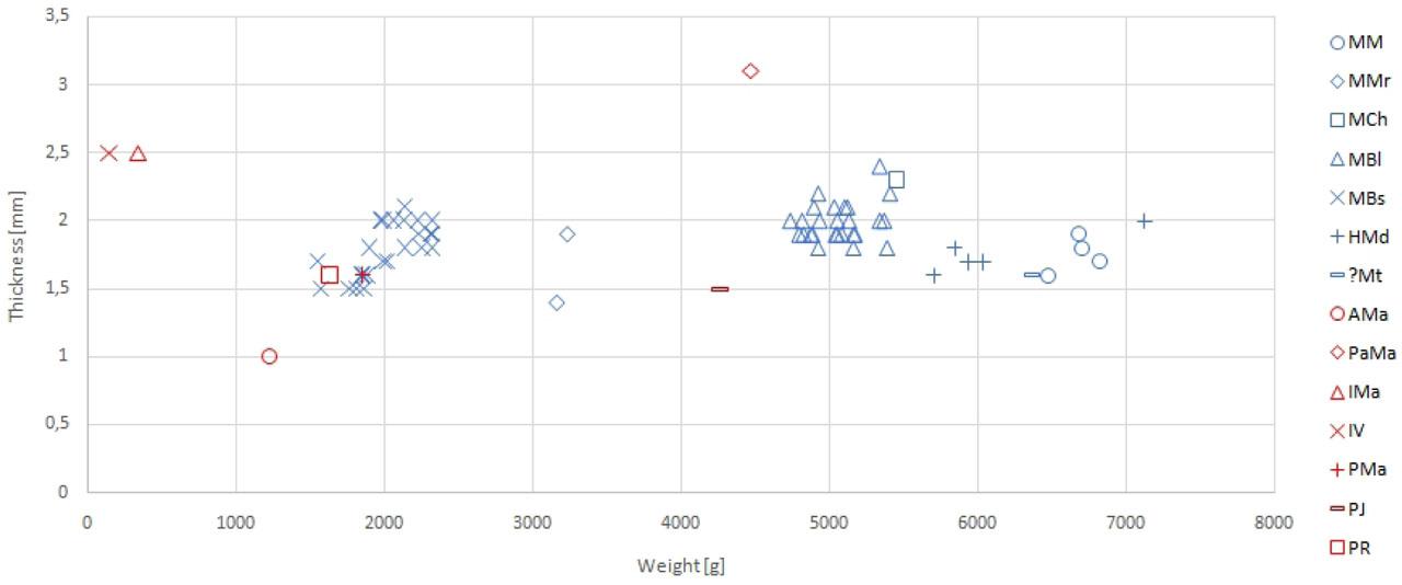 The scatter plot (see Fig. 5) shows further significant variability in MBs. Both quantities have a rather linear dependence. In contrast to the dimensions, there are significant differences in both the weight (approx. 3/4 kg) and the thickness of the plates (approx. 0.6 mm). The variability may indicate, above all, the primitiveness of the production technology, producing qualitatively different outputs, or differences in the original input products, using semi-finished plates. Sections I and VI, which have been completely overwritten over time, do not show measurable deviations from the rest of the set. A similar trend is noticeable for HMd between a four-leaf and a single-leaf overview map. Despite the minimal size difference, the overview map plate is noticeably heavier and thicker than the rest of the file. On the contrary, ?Mt is close in size, weight and thickness to a set of detailed HMd plates. Leaving aside the overall dimensions, MCh is very close to MBl in quality. The set of MBl printing plates shows a considerable variance of values in their thickness. The difference between the thinnest and thickest plate is similar to the 0.6 mm as seen in the case of MBs. However, the dependence on weight is not as clear-cut as with MBs, as even heavier plates have a low thickness. This relationship can be explained by the variation in the size of the individual plates (see Fig. 3). Graphs 3, 4, and 5 show the difference in the indicators between a set of printing plates from the Mediterranean and the northern areas, whether it is the overall size, thickness or weight. The only exception is PMa and PR (Rome), which is qualitatively similar to MBs (Augsburg). From this, it can be deduced that the input material is the same for two geographically different localities, which could be commercially interconnected.