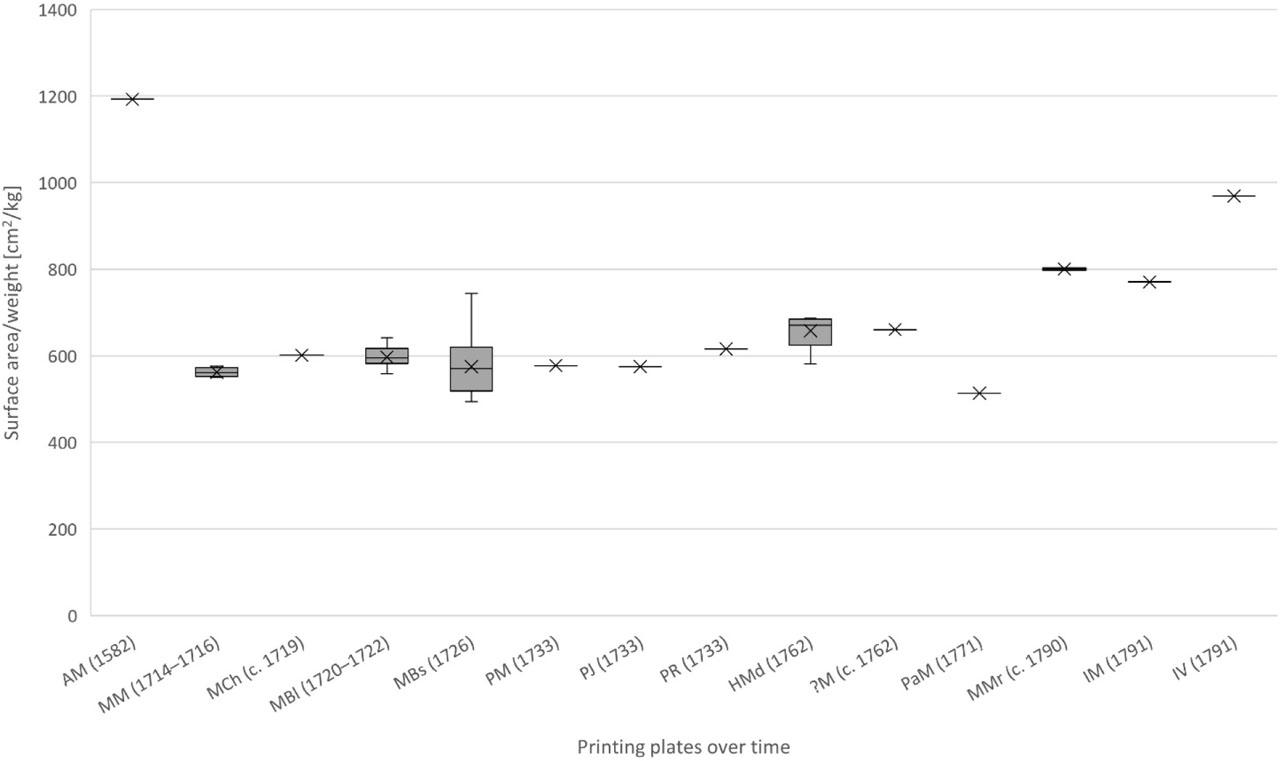 In order to obtain comparable data, the measured values were further standardised in the form of the surface area per weight (cm2/g or cm2/kg) or the bulk density of copper in grams per cm3. The obtained data allow for a comparison of the quality of copper used for the production of plates, from different time periods and places of origin, with regard to technological sophistication. The measurements are given in appendices 2 and 3.
