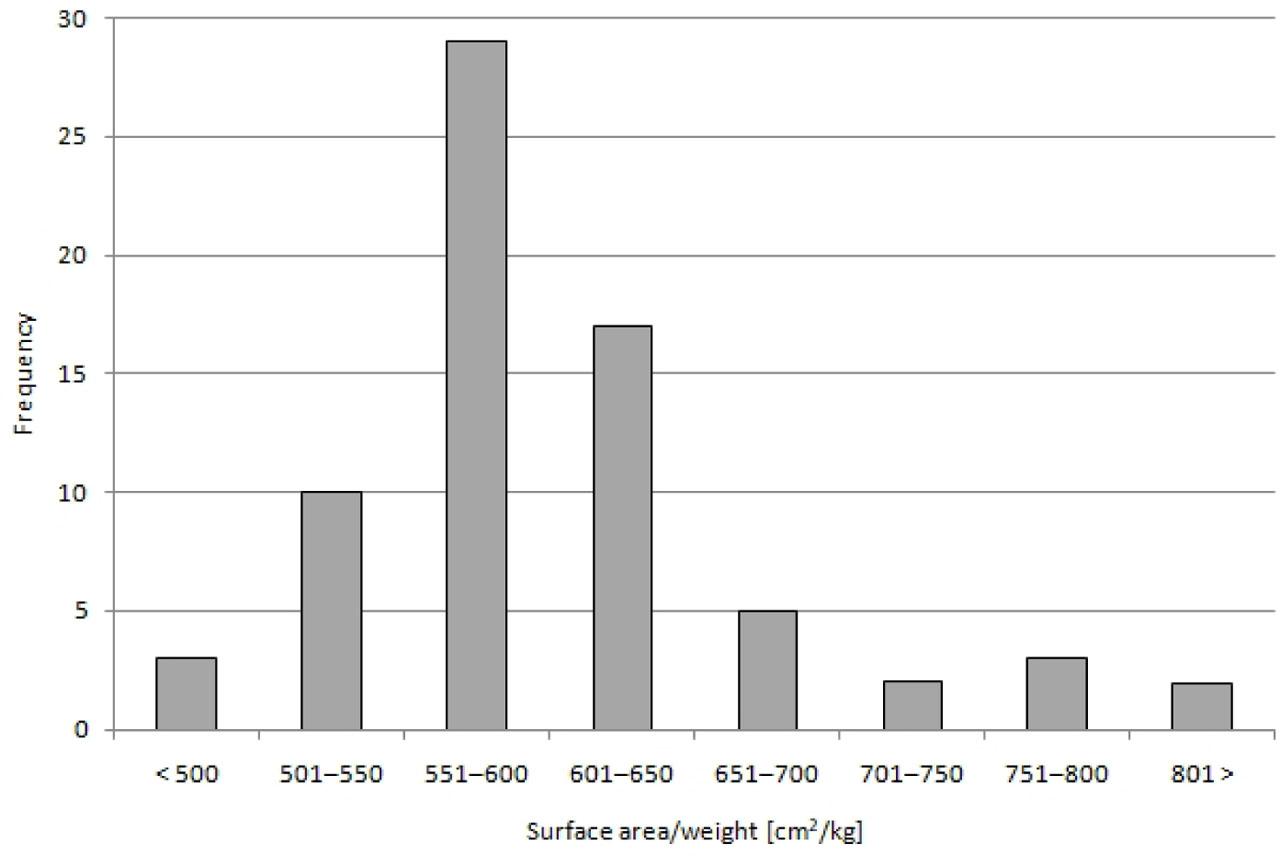 The distribution of the frequency of plate area values per kilogram is shown in Figure 7. The distribution is not completely symmetrical. It stretches in the direction of the maximum values. Values in the range of 551–600 cm2/kg are most often represented. The graph shows the highest concentration of values around the average, with measurements occurring even above 700 cm2/kg. The area-to-weight ratio of AM (c.1,200 cm2/kg) can be considered as a complete outlier.