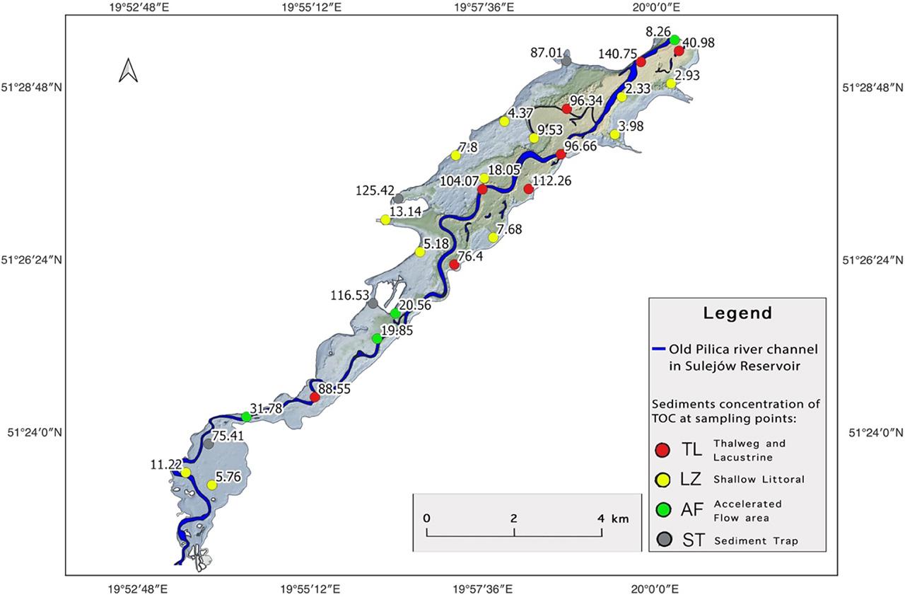 Sulejów Reservoir bottom sediments concentration of Total Organic Carbon (TOC) at sampling points with different sedimentation conditions: TL – thalweg and lacustrine zone, LZ – shallow littoral zone, AF – accelerated flow area, ST – sediment trap