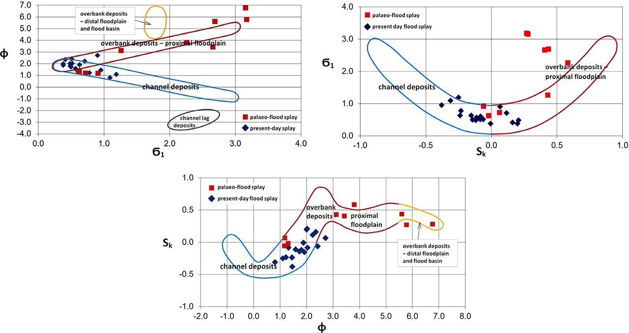 The grain size parameters calculated according to Folk & Ward (1957) locate the present-day splay deposits (Fig. 5) exactly on the margin of two fluvial facies: the channel and the proximal zone of the floodplain (overbank). The palaeoflood splay deposits also belong mostly to the overbank facies of the proximal floodplain but some of the samples reveal values typical for facies of the flood basin – the distal zone of overbank sedimentation on the floodplain.