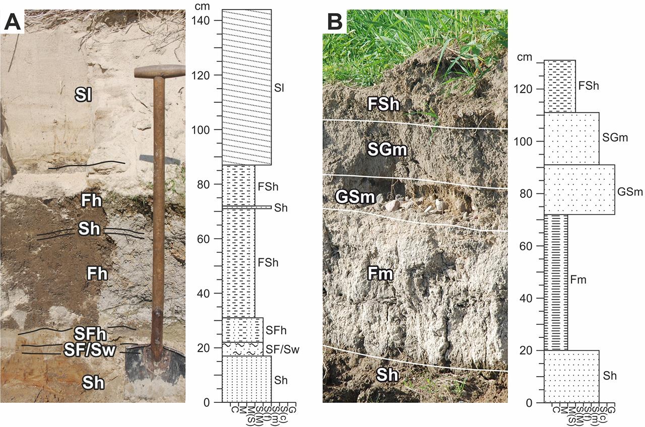 The 40 cut banks with exposed alluvial deposits are presented in supplemental information (SI); each one is described using the lithofacies code and with the putative identification of the depositional environment (zone) – channel, proximal floodplain or distal floodplain. The sections are numbered (see SI) according to the detail on the maps (figures 2 and 3). For two of the sections – one that we found the most typical (No. 1) for the study area and another the most extraordinary (No. 15), we also present pictures (photos) taken in the field – figures 6A and 6B, respectively.