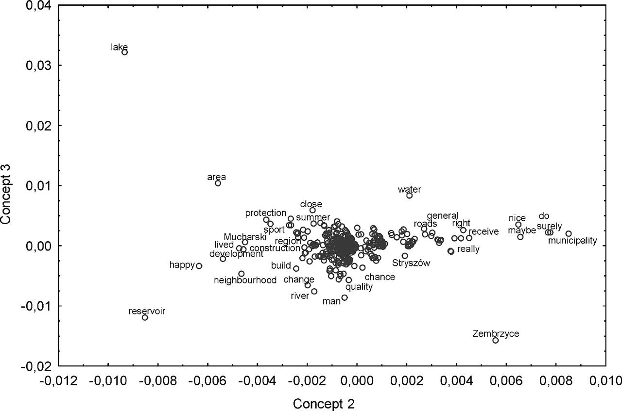 The word construction bears high relevance, including when used as a phrase with development, neighbourhood, content, change and protection, in the set of answers given by people who are content living near the reservoir. A further phrasal relationship was discovered for area, protection, sport and summer. Meanwhile, the third cluster includes municipality, road, do and nice (Fig. 2)