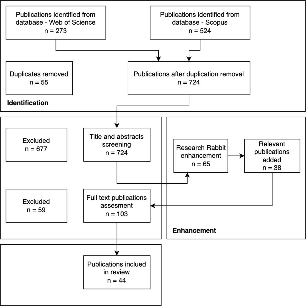 To compile a comprehensive and relevant corpus of articles, proceedings, and book chapters using only search query proved to be very challenging. After removing duplicates (55) and conducting an initial screening based on titles and abstracts, a total of 65 out of 724 publications were identified.