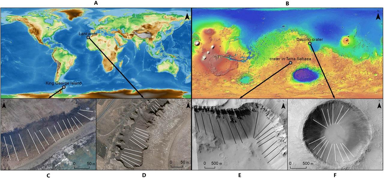 Location of selected talus slopes on Earth (A) and Mars (B), with marked transects (white and black lines on lower insets) on King George Island (C), Lanzarote (D), Terra Sabaea crater (E) and Dacono crater (F)