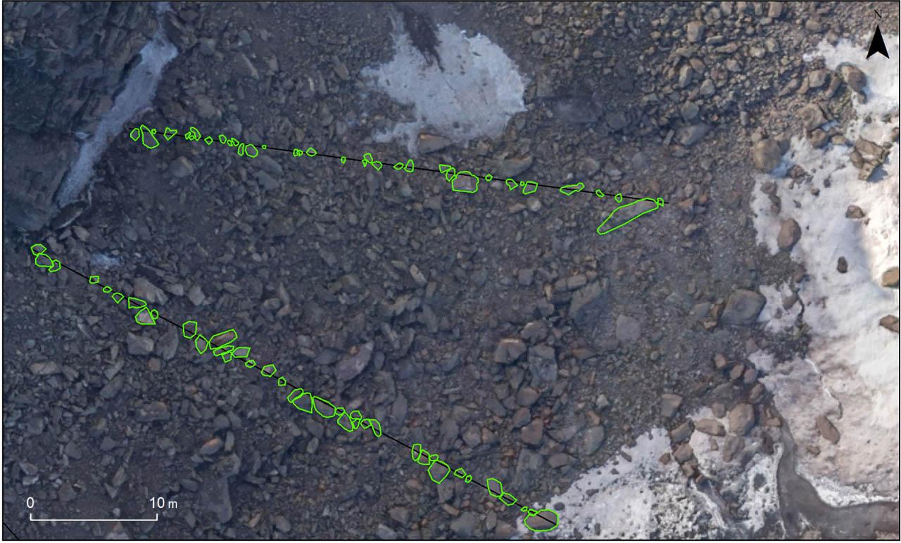 Example transects on King George Island with marked boulders