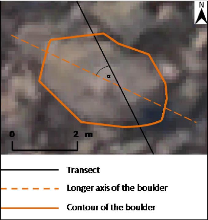 An example of the difference (angle α) between the orientation of a given transect and the longer axis of boulders along this transect