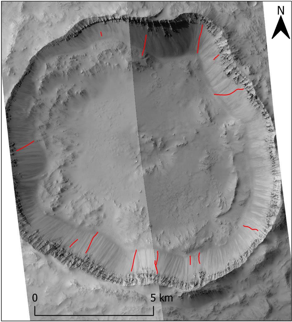 The talus slope in the Terra Sabaea crater is much larger than the one in the Dacono crater. This applies both to the size of the talus slope and the height of the scarp above it. The average scarp height of the Terra Sabaea crater is 178.4 m; in the Dacono crater, it is just 54.9 m. This means that there is a large difference in the speed of the boulders that hit the talus slope and a greater predisposition to bouncing transport.