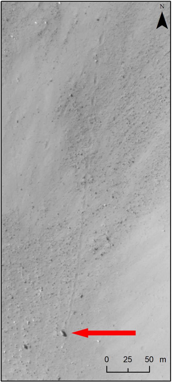 The marked boulder with the trace it left during transport – example from the Terra Sabaea crater