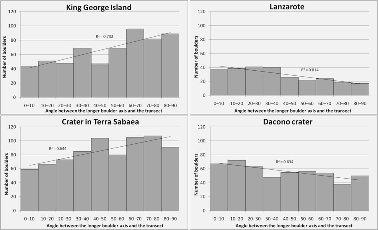 Position of the longest axes (acute angles) of studied boulders versus directions of the transects on Earth and Mars