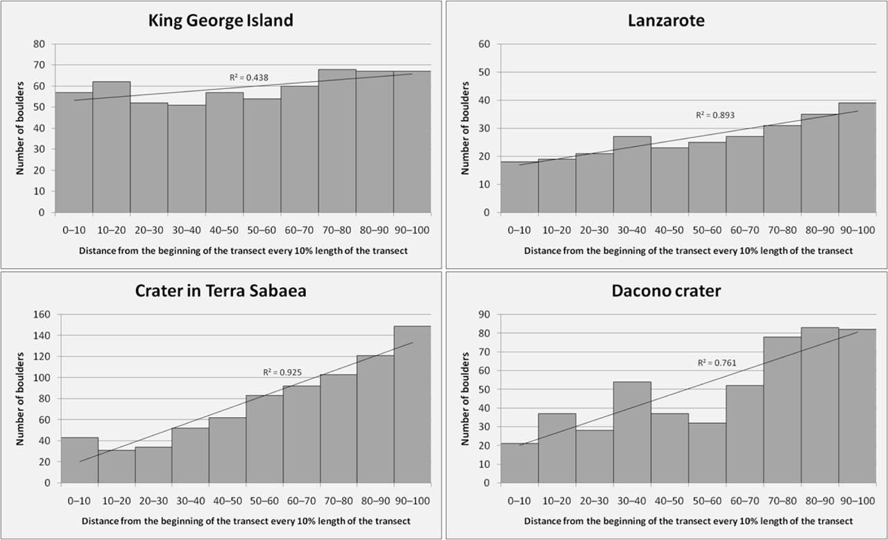 We analysed 595 boulders on the KGI talus slope, 265 boulders on Lanzarote, 770 boulders in the Terra Sabaea crater and 504 boulders in the Dacono crater. The angle of natural repose on the analysed talus slopes varies: on Earth, it is 28.0° (KGI) and 33.4° (Lanzarote), while, on Mars, taluses are inclined at a smaller angle: 16.7° (Dacono crater) and 24.7° (Terra Sabaea crater). Boulder density along the transects is much greater on Earth (one boulder every 1.7–3.33 m of transect) than on Mars (one boulder every 16.97–20.93 m of transect).