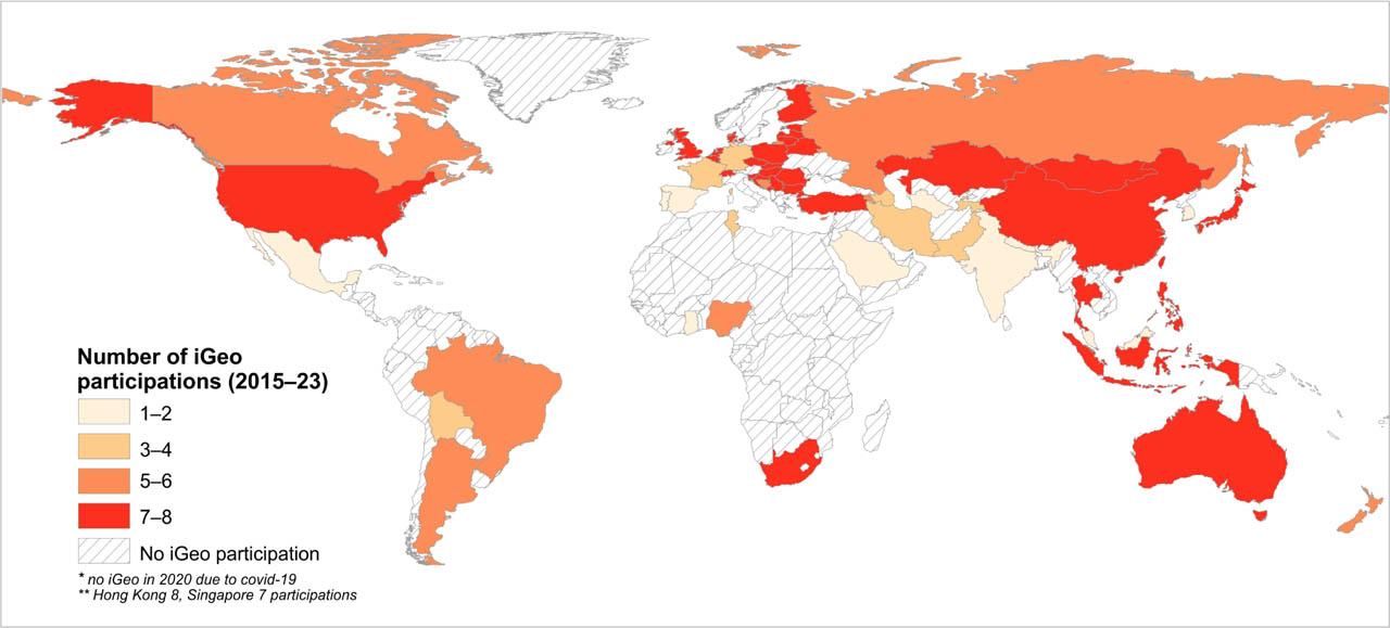 Pearson's product–moment coefficient of success in individual parts of iGeo as a function of the number of times individuals and states participate