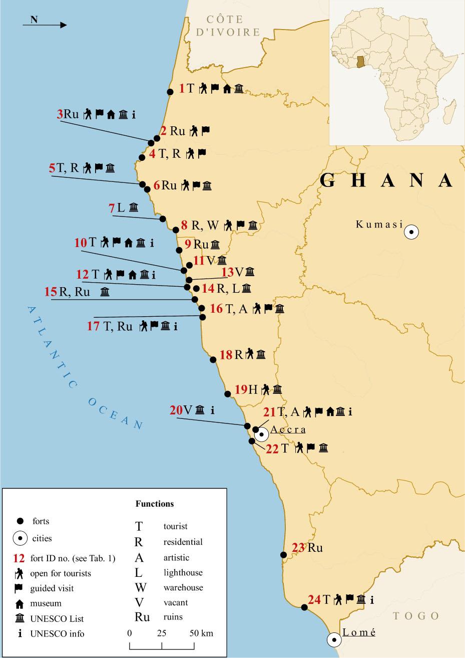 Furthermore, the place these fortifications occupy in the contemporary spatial and functional structure of the villages, towns and cities of Ghana has been omitted, to the best of our knowledge. It is important to analyse this issue since urbanisation pressure on monuments in African cities is increasing, while decision-makers and residents are currently facing numerous problems associated with this pressure.