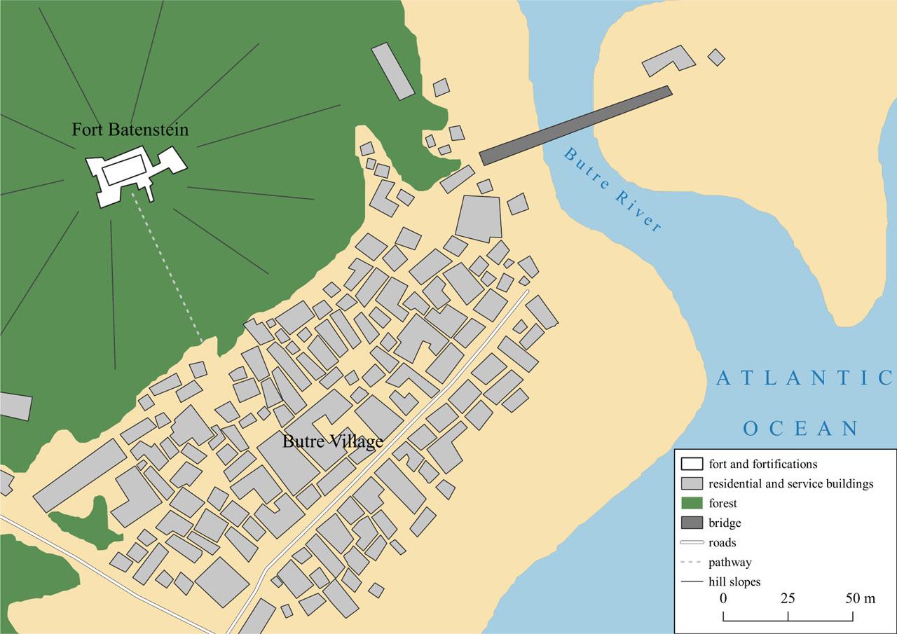 The location of Fort Batenstein in Butre Village