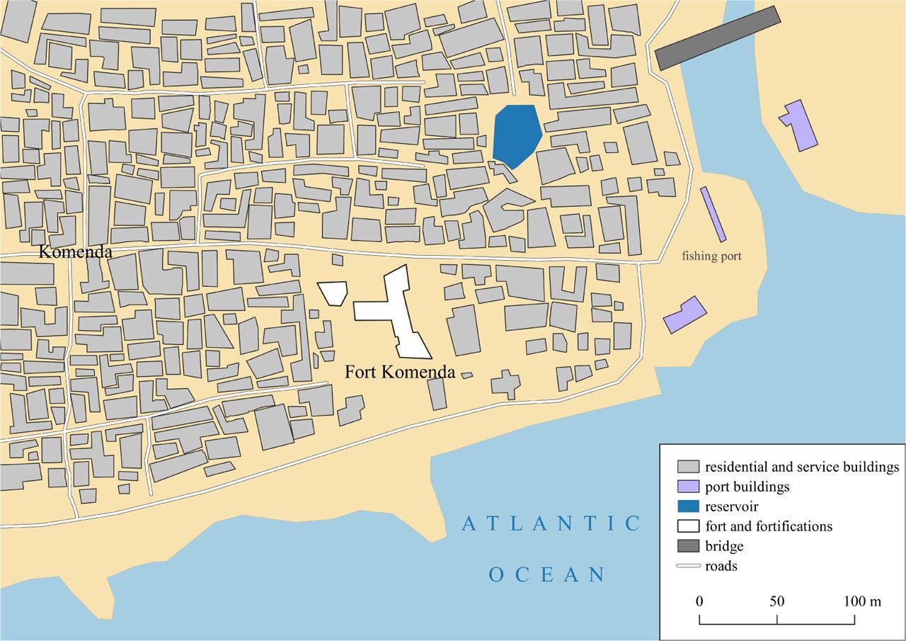 Academic literature has dedicated a lot of space to the history of European settlements on the Gold Coast (see, for example: Feinberg 1989; DeCorse 1992, 2001; Hansen 2002; Valsecchi 2011; Ipsen 2015), as well as to commercial forts built there from the fifteenth to the nineteenth century (Ephson 1970; van Dantzig 1980; Anquandah 1999; St Clair 2007; DeCorse 2010; eds Osei-Tutu & Smith 2017; Osei-Tutu 2018 – to name just a few). Due to the presence of gold, which had been sourced from the region for centuries, and which used to reach Europe through the Sahara before the age of great geographical discoveries, capturing the imagination on the Old Continent, this area has been of particular interest to almost all European colonial empires, as each emerged, since the fifteenth century. These included the Portuguese, Dutch, Danish, Swedish, British and even the Brandenburgers, whose installations were eventually transferred to Prussian control. Because of the uniqueness of the Gold Coast at that time, which eventually became attractive also – perhaps mainly – due to the slave trade (Rodney 1969), contemporary researchers have dedicated a lot of time investigating the history of the European presence in the region. They frequently focused on specific empires, such as the Portuguese (Vogt 1979), the Danish (Nørregård 1966; Weiss 2013), the Brandenburg-Prussian (Zaugg 2018), the Dutch (Feinberg 1974; Baesjou 1979; Postma 1990) and the British (Law 2001; Peterson 2010; Shumway 2014; Biveridge 2018), as well as the rivalry between them (Nathan 1904; da Silva 2011).