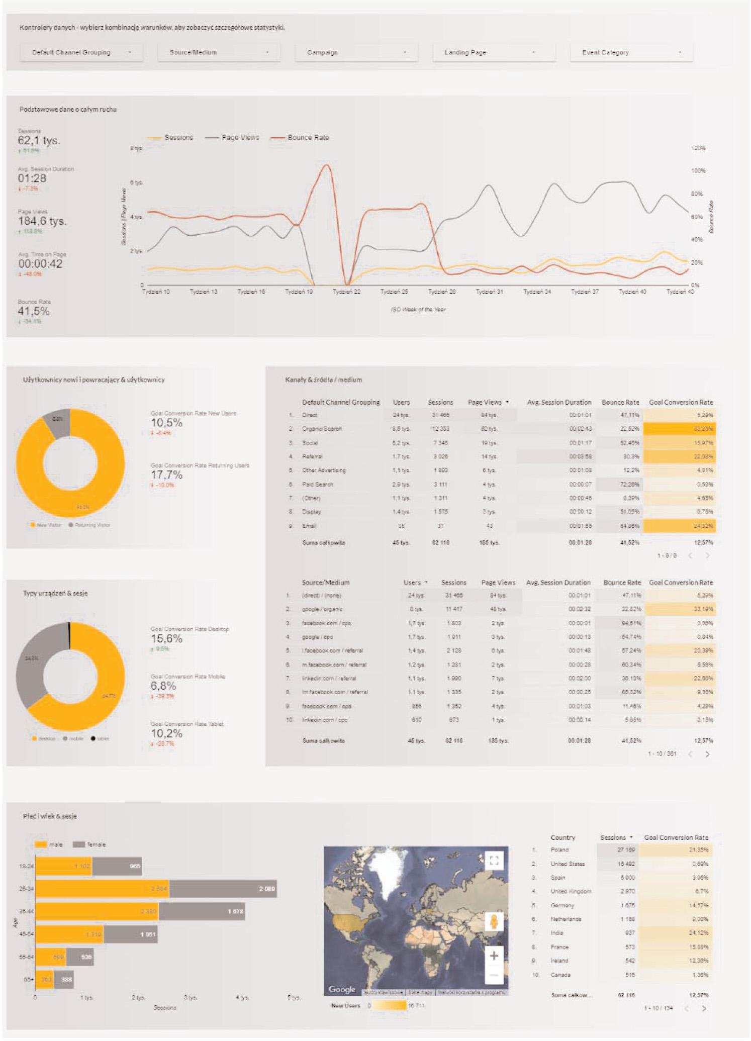 Each dashboard is created for the specific needs of a given organisation; hence, it is worth mentioning that the parameters can be easily adjusted in the Google Data Studio panel, which integrates data with our Google Analytics. This gives us the opportunity to expand such a report and personalise it for the selected organisation or department. Increasingly, companies decide on such solutions, because it is a very intuitive solution that saves time in the preparation of extensive reports on the many activities a given company conducts.