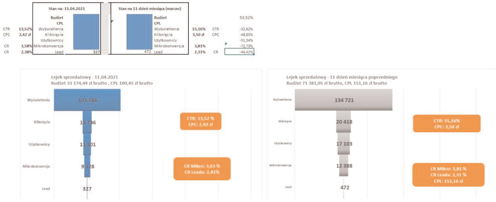 In Figure 4, we can see a practical example of the use of a sales funnel, which summarises the activities of an advertising campaign regarding the sale of a B2B company’s product. The sales funnel was constructed on the basis of the AIDA model, i.e. Attention, Interest, Desire, Action. Each stage of the sales funnel corresponds to the segment that is in a given stage of the consumer (company) path. The sales funnel usually consists of four stages; however, we can extend it by any number of selected indicators. In a specific example, we can observe parameters such as: ad impressions, clicks on the ad, number of users, micro-conversions and the number of leads. The entire data set is compared to the previous period, and the differences with this period have been calculated. Due to the correlation function between excel sheets, it is possible to automate the data shown on the funnel. Increasingly, we can meet with the concept of nesting.xml functions, which, due to mutual search between sheets, are able to refresh data after entering them into specific fields specified by functions. The sales funnel contains comprehensive information about the sale of applications. of one of the IT companies on a monthly basis. We can conclude that using a budget of about PLN 34,000, the company’s advertising was displayed 101,000 times, which turned into almost 14,000 clicks into advertising. This is the Attention, Interest stage in the AIDA model. Moving on to the next stages of the funnel, almost 12,000 people performed 9,000 microconversions set as a click on the ‘Let’s talk’ button on one pager, which resulted in 327 leads. This is a summary of the second stage of the AIDA model, i.e. Desire, Action. We can observe a high CTR indicator, which indicates a well-targeted campaign and high CR lead and microconversions. The whole funnel is also related to the previous month, where we can examine the effectiveness of advertising campaigns and product sales.