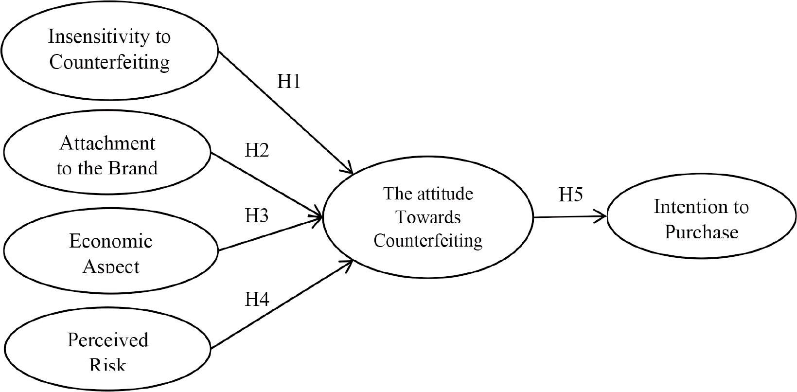 Our research work integrates a conceptual model on determinants that can influence attitude towards counterfeiting, that is, insensitivity to counterfeiting, brand attachment, economic aspect, and perceived risk. We also explore how consumer attitudes influence their intention to purchase counterfeit items.
