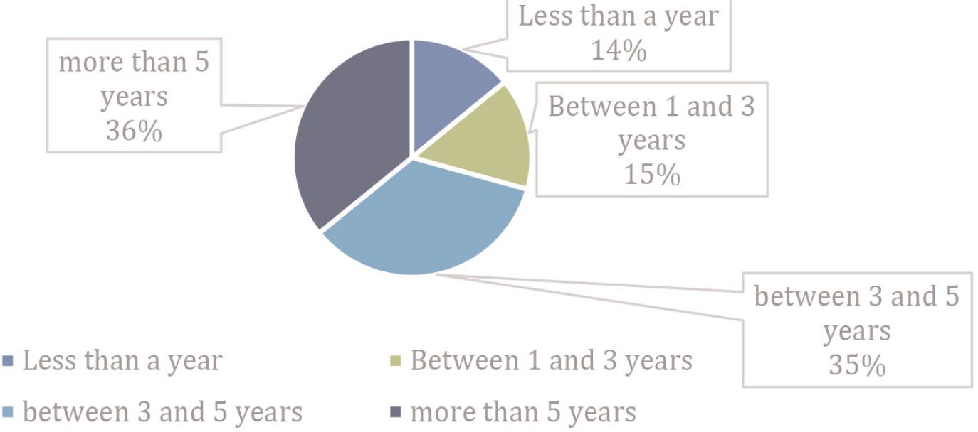 According to Figure 3’s descriptive analysis, the majority of respondents (36%) have been in their current jobs for more than 5 years, which suggests some degree of stability in Algeria’s telecommunications industry. A sizable component of the sample (35%) belongs to respondents who have worked for between 3 years and 5 years, whereas just 15% of respondents have worked for between 1 year and 3 years. Less than 1 year of employment was reported by only 14% of respondents.