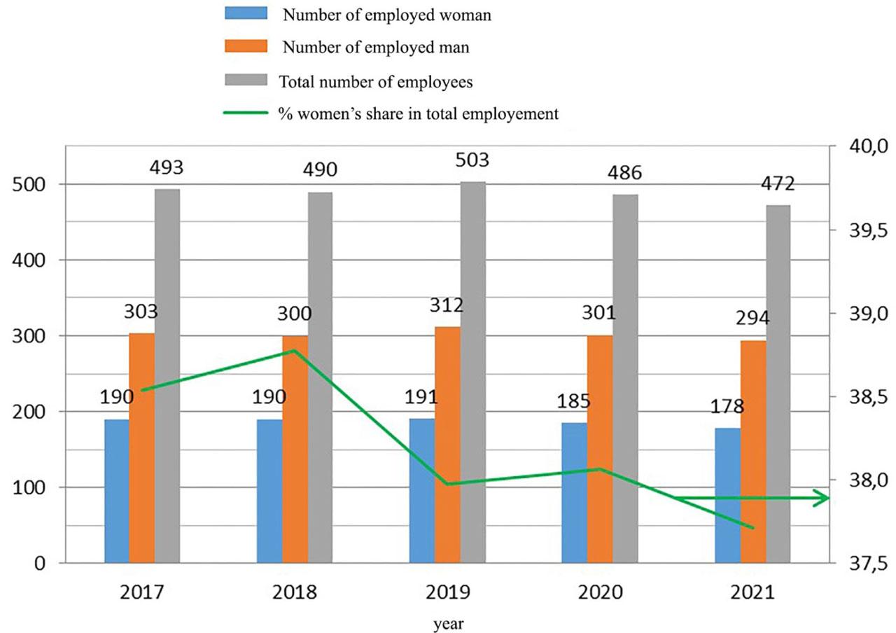 The employment structure at GIG-PIB has stabilized in recent years and amounts to about 500 people. Figure 1 shows the total number of employees in 2017–2021, broken down into women and men, and the percentage share of women in total employment. The share of women in employment at GIG-PIB has been around 38% in the last few years.