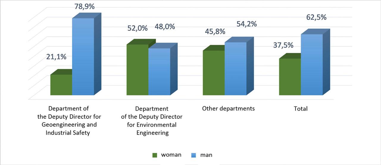Since its inception, the GIG-PIB has been an industry research institute, where the main subject of work, since its establishment in 1925, has been scientific support for the mining sector, mainly hard coal mining. This has had an impact on the structure of employment at GIG-PIB, especially in the so-called ‘mining’ research and development plants. For these reasons, among others, there was a predominance of men in employment at GIG-PIB, which is still visible today and is shown in Figure 2. Currently, there are two scientific and research divisions in GIG-PIB: the geoengineering and industrial safety division (formerly ‘mining’) and the environmental engineering division.