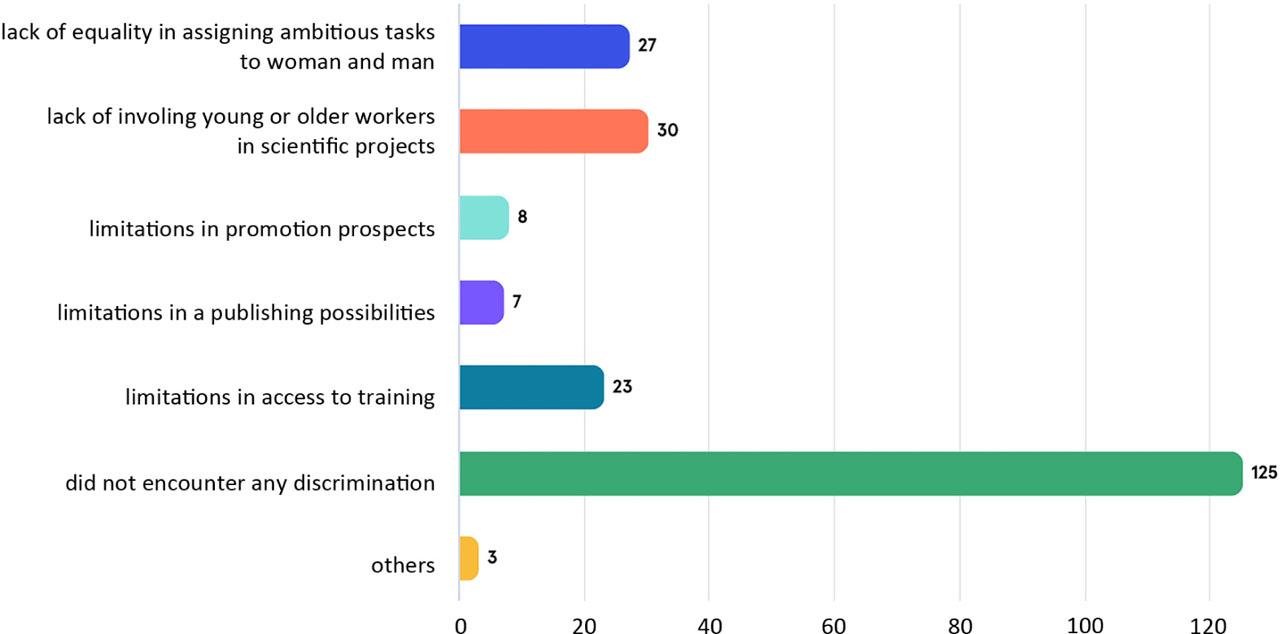 When asked about gender equality in the recruitment and career development process, it turned out that 56% of the respondents did not encounter any discrimination while working at GIG-PIB. Totally, 13.4% of the respondents experienced a situation where young or older workers were not involved in scientific projects, 12.1% experienced a lack of equality in assigning ambitious tasks to women and men and 10.3% experienced limitations in access to training. The extent of limitations to career development is shown in Figure 4.