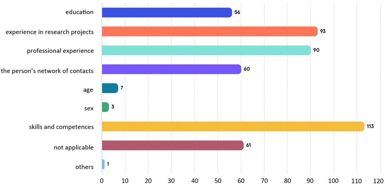 When it comes to the main questions concerning the thematic area related to gender mainstreaming in the research process, 69.2% of the respondents expressed the opinion that they had not encountered any gender-based discrimination in the GIG-PIB regarding access to participation in research projects. This means that every employee has the same access to scientific development through participation in research projects. The key criteria for this participation are competences and skills. This is confirmed by the answers obtained in the next question concerning the appointment of the project’s research team. As Figure 5 shows, respondents declare that in this case they mainly take into account: