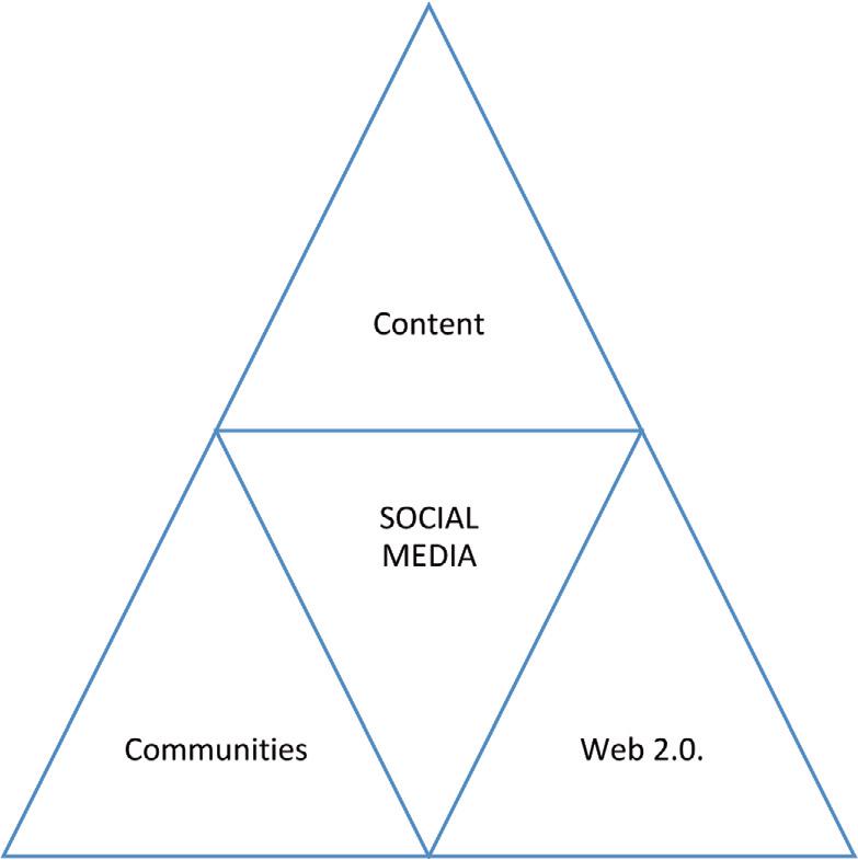 The rise of the Internet and social media has reshaped the perception and usage of mass media, leading to a division into old (traditional) and new media. The first group currently includes platforms like radio, television, and the press, while new media includes digital technologies (Kaznowski, 2010). At its core, social media can be defined in various ways, but Ahlqvist et al. (2008) propose an accurate structure that, in their opinion, captures the three most important pillars: Web 2.0, content, and virtual (network) communities (Fig. 3). They refer to this combination as the social media triangle, where each of these three elements is equally crucial to the communication process.