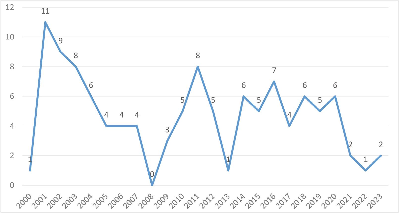 The number of registrations of new multi-level marking enterprises that still exist online today peaked visibly in 2001 and then progressively decreased to zero during the Global Financial Crisis. Since then, the rate of new registrations has shown fluctuations, gradually stabilizing by 2023 (Fig. 4).