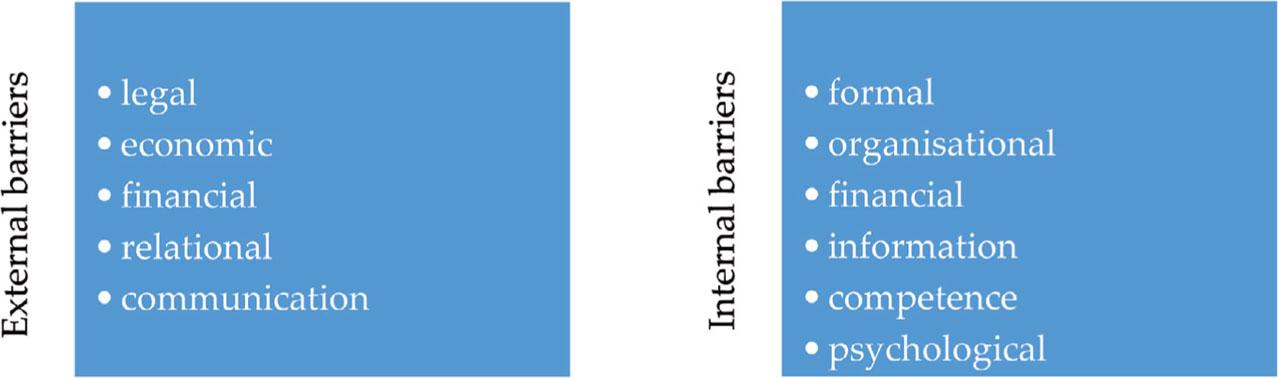 External and internal barriers to knowledge commercialisation and transfer.Source: original compilation based on Baycan and Stough (2013), Beyer (2022), Bjursell and Engstrom (2019), Czemiel-Grzybowska and Brzeziński (2015), D’Este et al. (2012), De Wit-de Vries et al. (2019), Namdarian and Naimi-Sadigh (2018), O’Reilly and Cunningham (2017), van de Burgwal et al. (2019)