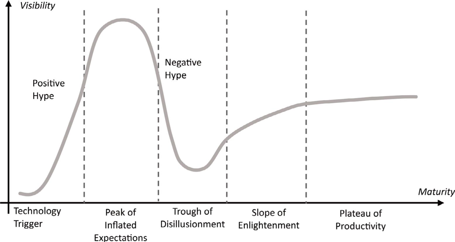The Gartner Hype Cycle is a well-known and useful depiction of the dynamics of hype. Developed in 1995 by the IT consulting firm Gartner Inc., this methodology describes the typical adoption pattern for any new technology (Figure 1) (Ferrara, 2013, p. 290). While the model was designed for technological innovation, it can be helpful for anyone deciding whether and when to implement a new product, process, idea, or practice (Fenn & Raskino, 2008, p. XV).