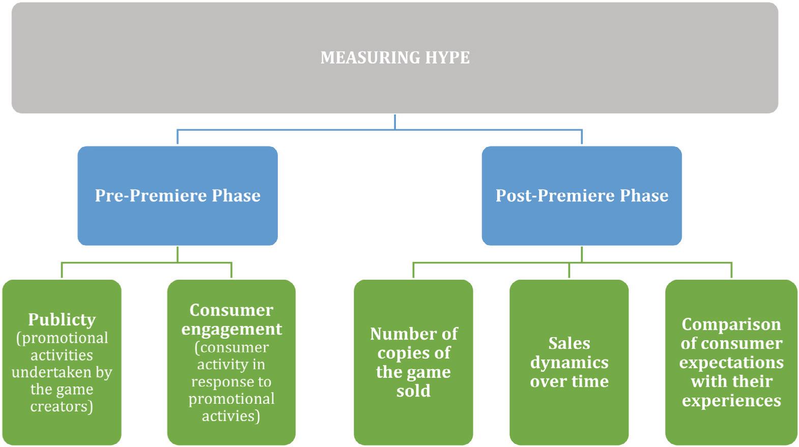 The publicity indicator encompasses promotional activities undertaken by game developers, which can be measured by taking into account the costs of creating promotional materials (e.g., trailers) and advertising costs in traditional and digital media, such as television, public spaces, brick-and-mortar stores, and social media. Consumer engagement, in turn, refers to consumer activity in response to these activities and can be measured based on the number of trailer views, the number of reactions and comments on social media, the number of pre-orders and game add-ons, and the frequency of searches for the game title in online search engines. This information, supplemented with data from the post-release phase, including the number of copies sold, sales dynamics over time, and a comparison of consumer expectations with their actual experiences, provides the basis for a broad measurement of hype. In practice, operationalizing this phenomenon requires the integration of both official data and observations of consumer activity in the digital space, which allows for a more holistic approach to the process being analyzed.