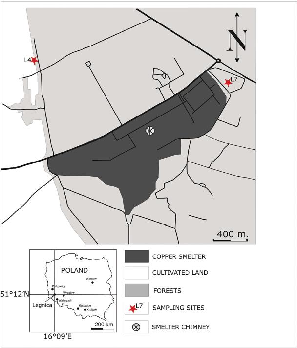 The copper smelter in Legnica was established in 1951 and started processing ore in 1953. At first, the material from the Old Copper Basin (‘Lena’ and ‘Konrad’ mines) was processed with an annual production capacity of 12,500 tons. The feeding material changed after the discovery of the new copper ore deposit in the Fore-Sudetic Monocline in 1957 by Jan Wyżykowski based on the interpretation of geological maps by Józef Zwierzycki. The processed ore came from the Lubin and Polkowice mines and the production capacity increased in 1960 to 60,000 tons annually. Currently, the Legnica Copper Smelter produces >120,000 tons of electrolytic copper every year (https://kghm.com/). Over the years the smelter underwent modernization, also in the aspect of environmental protection. The emissions of metal-rich dusts were reduced in the 1980s and in the late 1990s, such that in 2000, the total dust emission was 96.6% smaller compared to 1995 (Monograph of KGHM Polish Copper Company, 2007; Strzelec & Niedźwiecka, 2012). Despite these modifications, the concentration of metallic elements in air and soil around the Legnica smelter remains elevated, often overstepping regulatory guidelines (Karczewska et al., 2010; Medyńska-Juraszek & Kabała, 2012; Stojanowska et al., 2020). For example, the soils immediately around the smelter that are considered the protection zone have the maximum Cu content of over 2.5 wt% (Lis & Pasieczna, 2005).