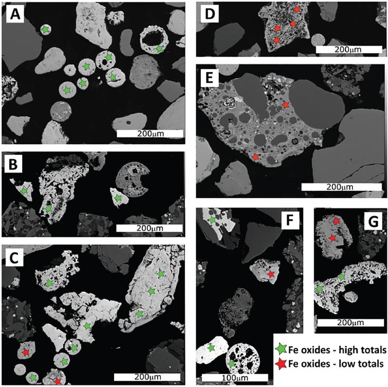 Back-scattered electron images of two types of Fe oxides identified in this study. The two groups are identified based on their chemical composition and a distinct character of the groups is reflected by low and high totals of the electron microprobe analyses. These two groups are indicated in the Figure with different colors of the stars. (A) numerous spherical particles composed entirely of Fe-oxide with high totals; (B) small angular monomineralic fragments (i) and a larger porous particle (ii); (C) spherical particles (i), larger porous particles (ii) and anhedral, strongly porous grains (iii), (D) strongly porous grain with low total; (E) a Fe-rich glass-like material containing quartz grains; (F) a skeletal grain within a slag fragment (i), anhedral, strongly porous grains (ii), small angular monomineralic fragment (iii) and a spherical particle (iv); (G) larger porous particles.