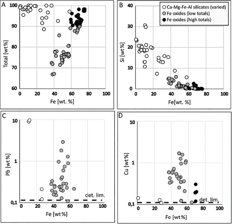 Composition of two types of Fe oxides (low and high totals) and Fe-rich silicates. The detection limit of electron microprobe analyses is indicated (det.lim.), phases shown in (A,B) and not in (C,D) have Pb and Cu contents below the detection limit.