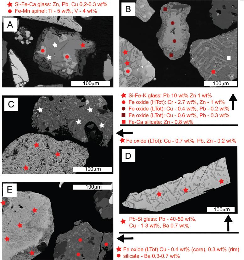 This group included angular fragments composed of several phases and it was strongly diversified in terms of phase composition and texture. Figure 4 shows examples of six slag fragments and each of them contains different phases with variable metallic elements contents. Spinels and silicates are common phases, but they differ in composition between the slag fragments; also, glassy material is strongly compositionally diverse (Figs. 4A and 4B and Supplementary Material). For example, Pb content in slag glass is either below the detection limit (white symbols in Figs. 4A–4C), reaches 10 wt% (red star, Fig. 4B), or is as high as 40 wt% (Fig. 4D). Some fragments do not contain Cu, Zn, and Pb, but show elevated contents of other elements such as V (Fig. 4A) or Ba (Fig. 4E). Also alteration features range from extensive (rims in Figs. 4A and 4E) to absent (Figs. 4B–4D).