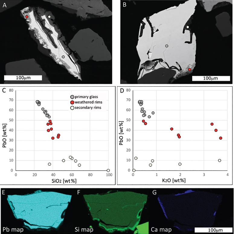 (A,B) Back-scattered electron images of Pb-rich silicate glass showing weathered rims. (C,D) Electron microprobe analyses shown for all analyzed particles in this group, the analyses are divided into three groups based on the observed extent of weathering in BSE images. The analytical points belonging to each group are shown in (A,B). (E–G) EDX maps for Pb, Si, and Ca of a Pb-silicate glass particle. The relative color intensity scale shows the element-rich (bright) and element-deficient (dark) parts of particles.