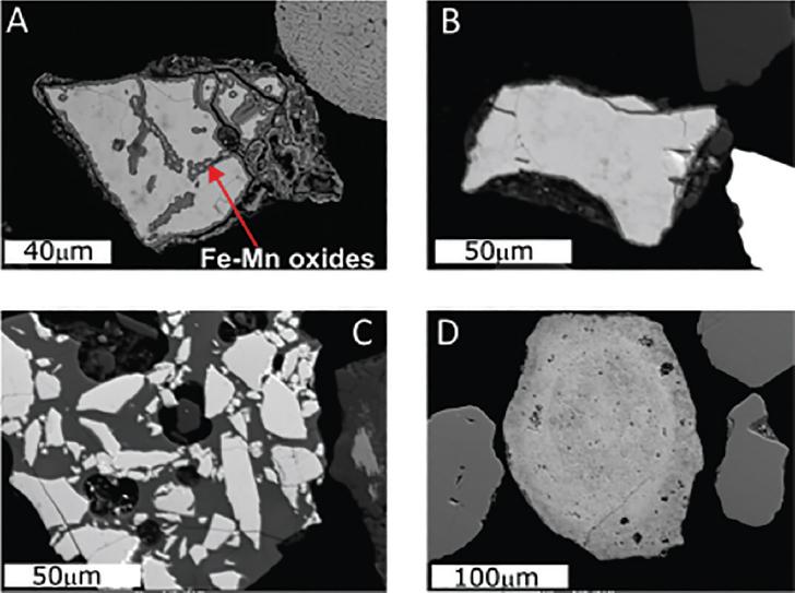 Back-scattered electron images of minor phases occurring in the studied soils: (A) chalcopyrite with well-developed weathering features, the secondary products include Fe oxides with Mn and Co, and silicates, (B) chalcopyrite with thin weathered rim, (C) zircon breccia in Zr-rich glass, and (D) phosphate grain.