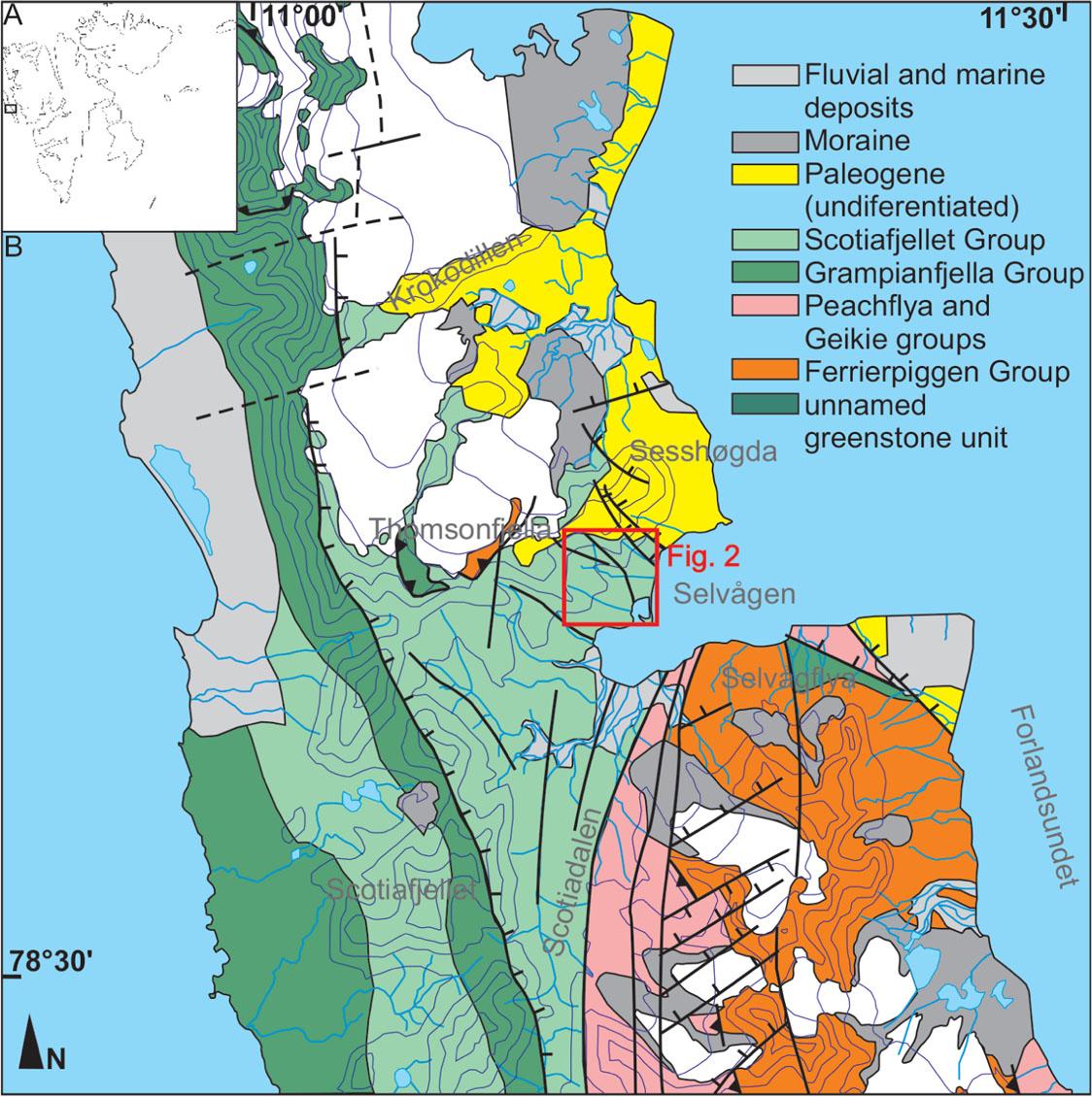 The island is built of two parts, northern and southern, that are juxtaposed on the N-S trending Baklia Shear Zone that runs from Selvågen to Haukebukta (Hjelle et al., 1979); (Fig. 1B). The southern part of the island is composed of Neoproterozoic metasedimentary succession intercalated with minor volcanics and occurs only locally in the northern part of the island where it overthrusts the northern successions (e.g. Manby, 1986). The northern part consists predominantly of the carbonate and siliciclastic dominated Grampian Group that is underlain by the Scotiafjellet Group comprising phyllites, slates and metacarbonates with chert nodules (Hjelle et al., 1979; Tyrrell, 1924). These two groups of preassumably late Neoproterozoic age locally overthrust the Pinkie Group which is a Neoproterozoic complex metamorphosed under amphibolite facies conditions during the Ellesmerian Orogeny ( Kośmińska et al., 2020). PKF was subjected to at least three tectonic events including Caledonian, Ellesmerian and Eurekan episodes. The earliest deformation and metamorphism was connected to westward folding and thrusting, and subsequent rejuvenation of tectonic structures (Manby, 1986; Schneider et al., 2019). In the northern PKF tectonic discontinuities are accompanied by carbonate veins composed of siderite, dolomite and pyrite.