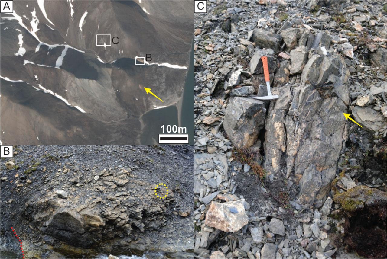 (A) Satellite image of the sampling area. Example of carbonate vein rich in siderite marked with yellow arrow. (toposvalbard.no) (B) Outcrop of magnesite in contact with surrounding black marbles and phyllites marked with red dotted line. (C) Close up image of the magnesite outcrop with visible bands of black metachert (marked by arrow). Note multiple dolomite veins crosscutting the vertical foliation within magnesite.