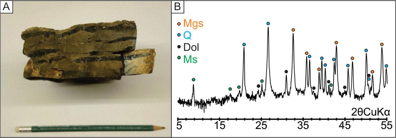 (A) Photograph of a sample of the metacarbonate with cherts. Cherts are preserved as horizontal black discontinuous bands and smaller nodules within microcrystalline metacarbonate matrix (B) Mineral composition of the metacarbonate rock based on the XRD pattern.