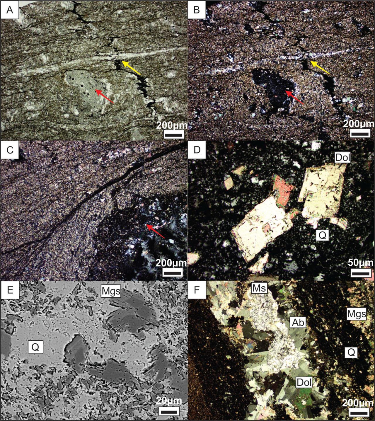 (A, B) Microphotographs of laminated magnesite rock around a small chert nodule in the centre (red arrow). A stylolite (yellow arrow) oblique to foliation and crosscut by a dolomitic vein is apparent (optical microscopy, A—1N, B—NX). (C) Foliation deflected around chert nodule marked with red arrow (D). Euhedral dolomite crystals embedded in finely crystalline silica of the chert (optical microscopy, NX). (E) Subhedral, zoned magnesites embedded in chert quartz matrix (SEM/BSE image). (F) First generation of dolomitic veins with albite and muscovite present.