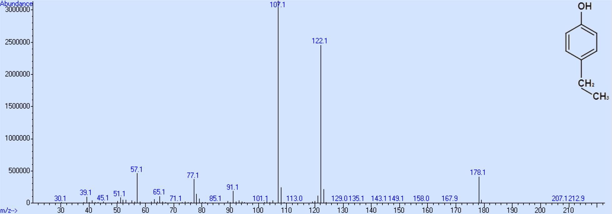 Massenspektrum von 4-Ethylphenol nach Derivatisierung mit Propionsäureanhydrid