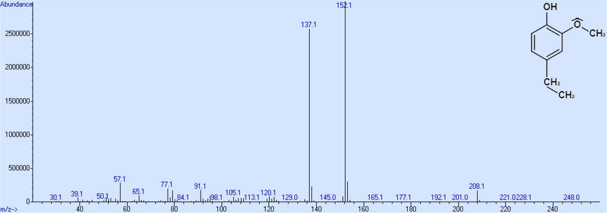Massenspektrum von 4-Ethylguajacol nach Derivatisierung mit Propionsäureanhydrid